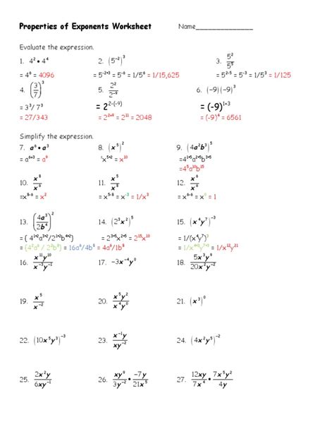 Web this is a set of worksheets that contains 4 sets of 10 exponent property problems for a total of 40 problems! Simplify each expression completely using properties of exponents. Web for example, if after simplifying an expression we end up with the expression x − 3, we will take one more step and write 1 x3.